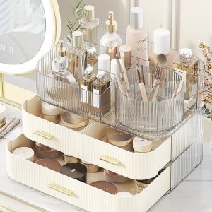 這一款化妝品收納是有分區設計的,讓你的每一個化妝品都有地方放置,採用的是加厚的材質,圓角的切割,不會劃傷,可以旋轉的設計,拿取更加的放心。